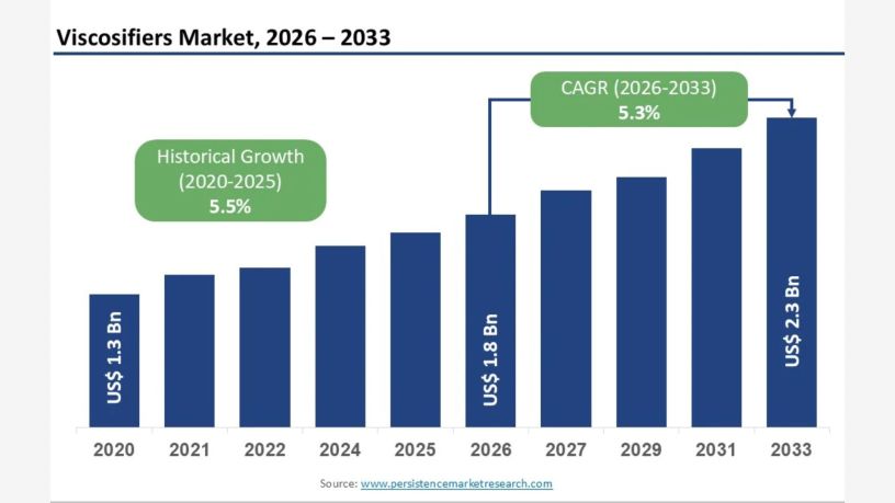 The global viscosifiers market is expanding at a healthy pace, supported by rising demand from end-use industries such as oil & gas, construction, personal care, and food & beverages. According to a report by Persistence Market Research, the global viscosifiers market is expected to be valued at around US$ 1.8 billion in 2026. Over the forecast period, the market is projected to grow consistently, reaching approximately US$ 2.3 billion by 2033. This growth reflects a compound annual growth rate (CAGR) of 5.3% during the period from 2026 to 2033, highlighting stable demand and long-term market potential driven by industrial expansion and formulation advancements.